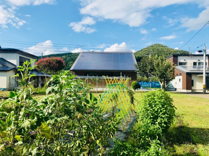 前を畑、後ろを山に囲まれたのどかな場所に建つ工務店の新社屋。